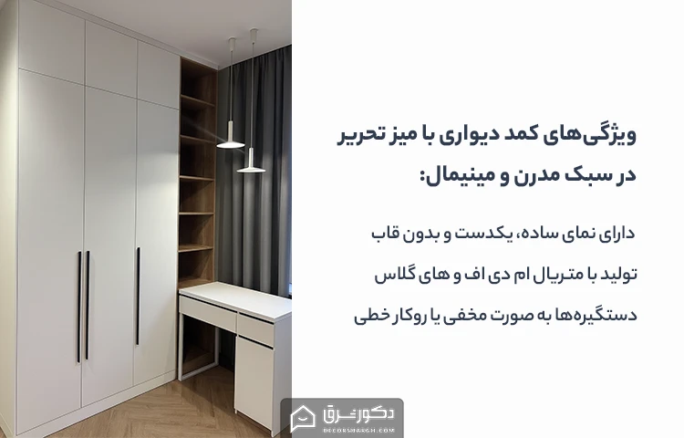 در سبک مدرن خبری از جزئیات اضافی و تزئینات کلاسیک نیست. درب های کمد دیواری با خطوط صاف، سطح یکدست و بدون قاب طراحی می شوند و میز تحریر که از نظر طراحی با کمد هماهنگ است، نمای مینیمالی دارد.