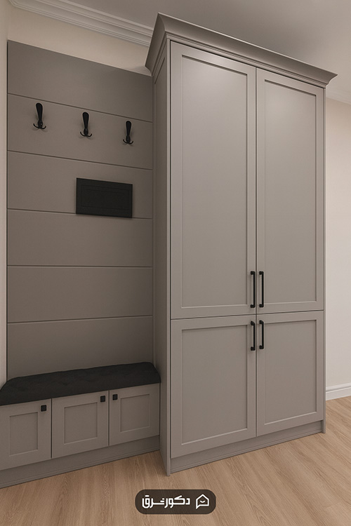 کمد دیواری ورودی به همراه جاکفشی و جالباسی، در دو سبک مدرن و نئوکلاسیک قابل اجراست.