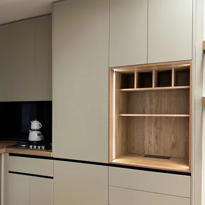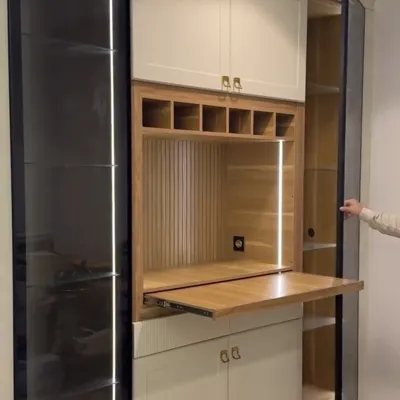 گاهی اوقات طراحان دکوراسیون داخلی کافی بار را به صورت توکار داخل کابینت در نظر می گیرند و زمانی که درب ها بسته اند، با بقیه کابینت ها یکدست به نظر می رسد. در این مدل برای راحتی استفاده، پیشنهاد می کنیم درب ها مدل پاکتی (pocket door) طراحی شوند تا پس از باز شدن، درب ها داخل کابینت جمع شده و دسترسی به تجهیزات راحت تر شود.