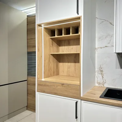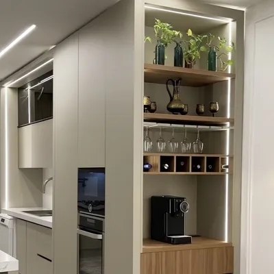 کافی بار روی کابینت، به یکی از ترندهای محبوب دکوراسیون آشپزخانه تبدیل شده که برای نگهداری و قرار دادن لوازمی مانند قهوه ساز، کتری برقی، ماگ ها و … استفاده می شود. در واقع طراحی این دکور کاربردی، باعث دسترسی آسان تر به وسایل قهوه و تجهیزات مربوط به آماده سازی آن می شود و به عنوان یک آیتم دکوراتیو، عمق و جذابیت بیشتری در فضای آشپزخانه ایجاد می کند.