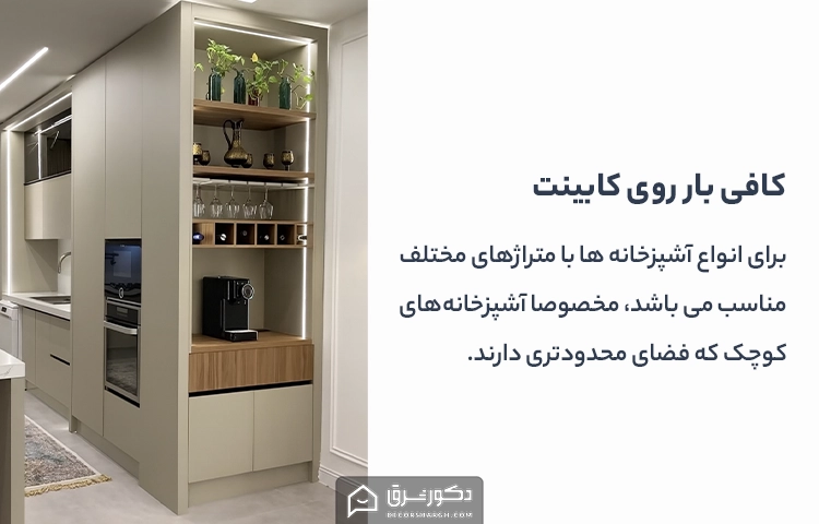کافی بار روی کابینت در انواع آشپزخانه ها با متراژهای مختلف مناسب است؛ خصوصا در آشپزخانه های کوچک که فضای محدودتری دارند، این دکور کاربردی روی سطح کابینت یا فضای کنار دیوار ساخته می شود که علاوه بر صرفه جویی در فضا، باعث ایجاد نظم بیشتری در آشپزخانه خواهد شد.