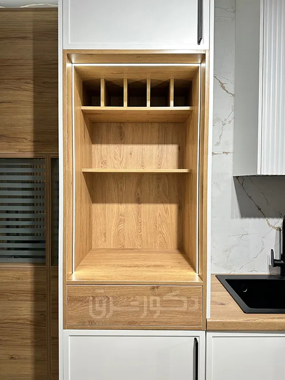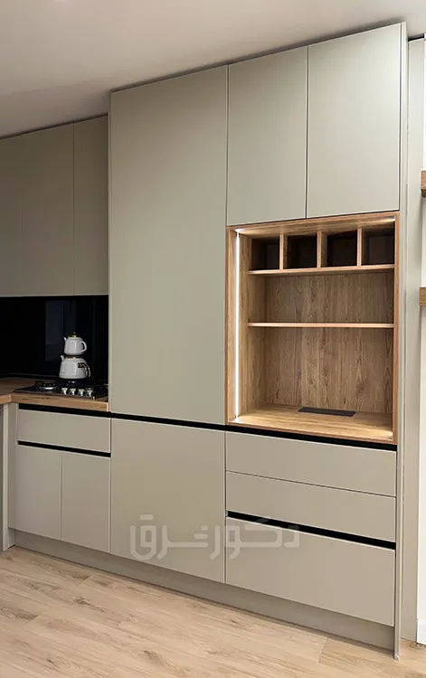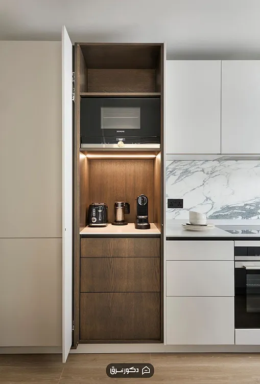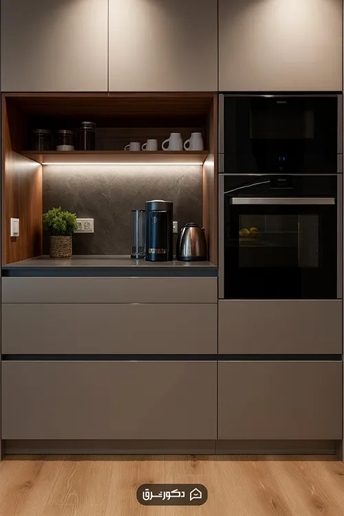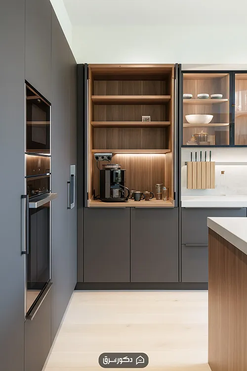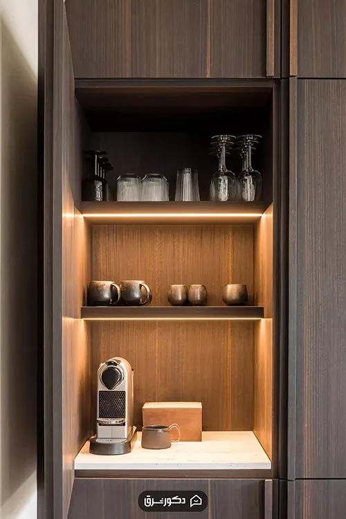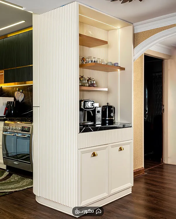 کافی بار روی کابینت، به یکی از ترندهای محبوب دکوراسیون آشپزخانه تبدیل شده که برای نگهداری و قرار دادن لوازمی مانند قهوه ساز، کتری برقی، ماگ ها و … استفاده می شود. در واقع طراحی این دکور کاربردی، باعث دسترسی آسان تر به وسایل قهوه و تجهیزات مربوط به آماده سازی آن می شود و به عنوان یک آیتم دکوراتیو، عمق و جذابیت بیشتری در فضای آشپزخانه ایجاد می کند.