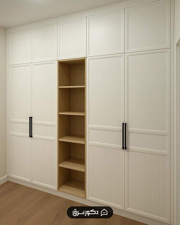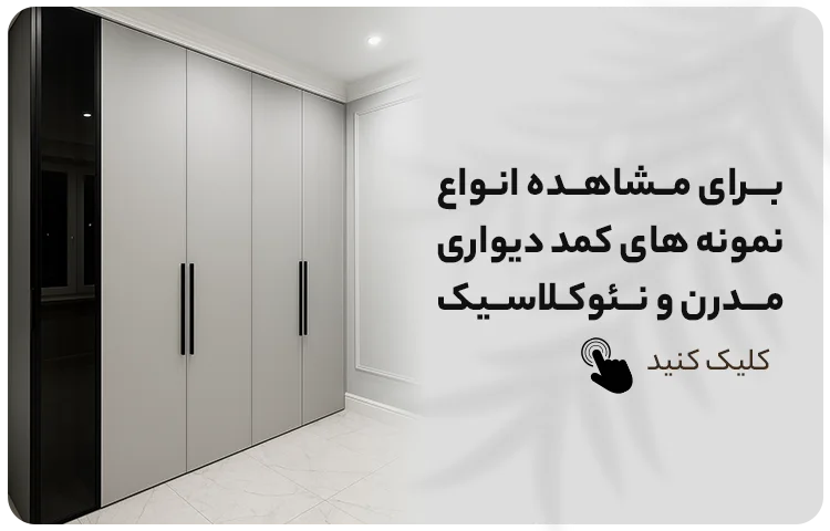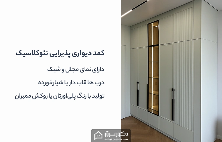 برای تولید کمد دیواری پذیرایی در سبک نئوکلاسیک، متریال های رنگ پلی اورتان و روکش ممبران به کار می روند که همراه با دستگیره های روکار با طراحی ظریف در رنگ های مشکی مات، طلایی یا برنز، نمای نئوکلاسیک کمد را تکمیل می کنند.