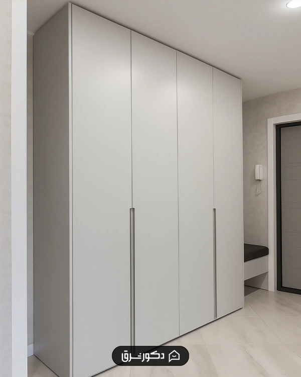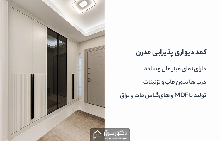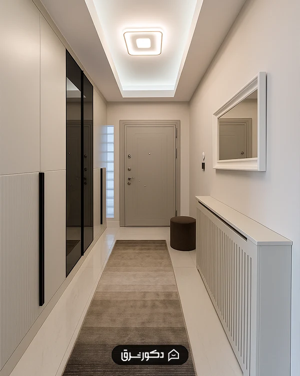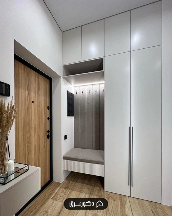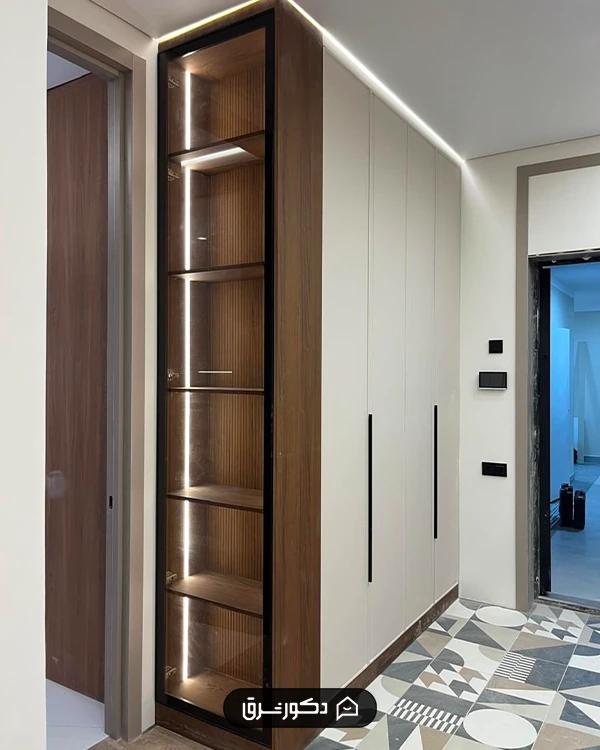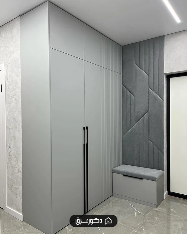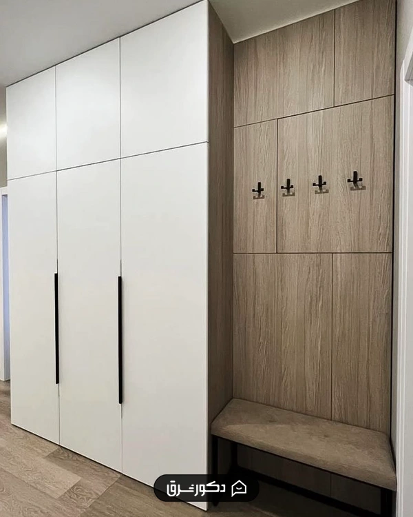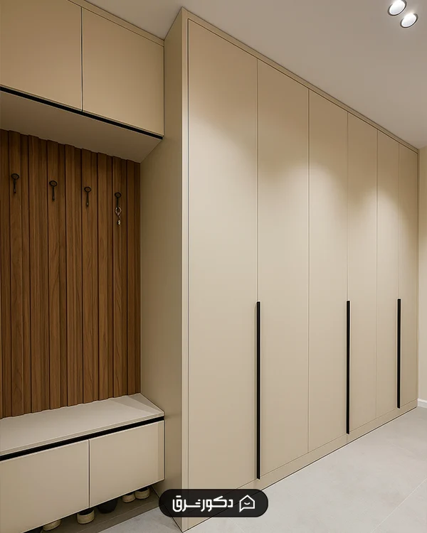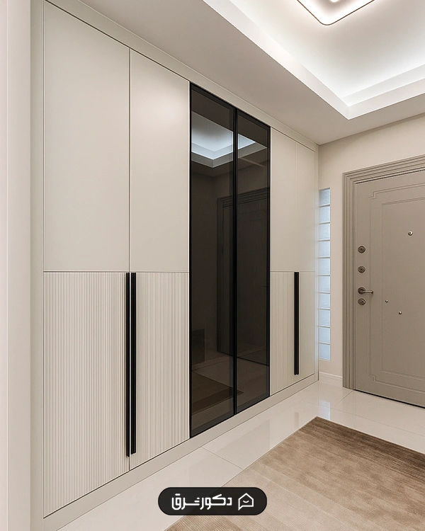در این طراحی معمولا یک سمت دیوار کمد دیواری در نظر گرفته می شود که برای نگهداری لباس ها، کیف و لوازم روزمره قابل استفاده است و سمت دیگر جاکفشی قرار می گیرد که در نهایت ترکیب این دو آیتم، نمایی یکدست، دکوراتیو و لوکس در فضای پذیرایی ایجاد می کند.