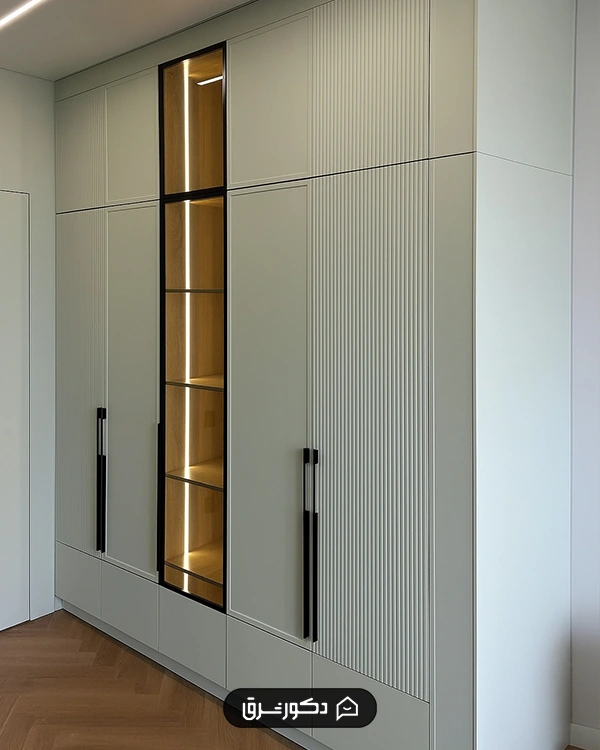 علاوه بر این نورپردازی خطی بخش مهمی از طراحی مدرن به حساب می آید که باعث تاکید بر بافت و فرم کمد دیواری پذیرایی می شود.