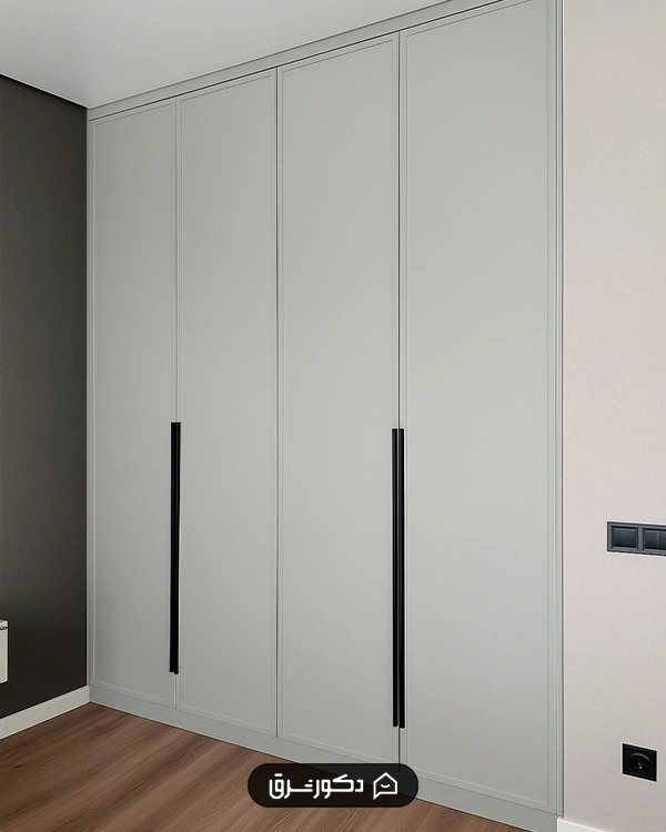 استفاده از دستگیره های مخفی با مدل های مدرن در رنگ مشکی برای این کمد دیواری پذیرایی ایده آل است که فرم مینیمال آن را حفظ می کند.
