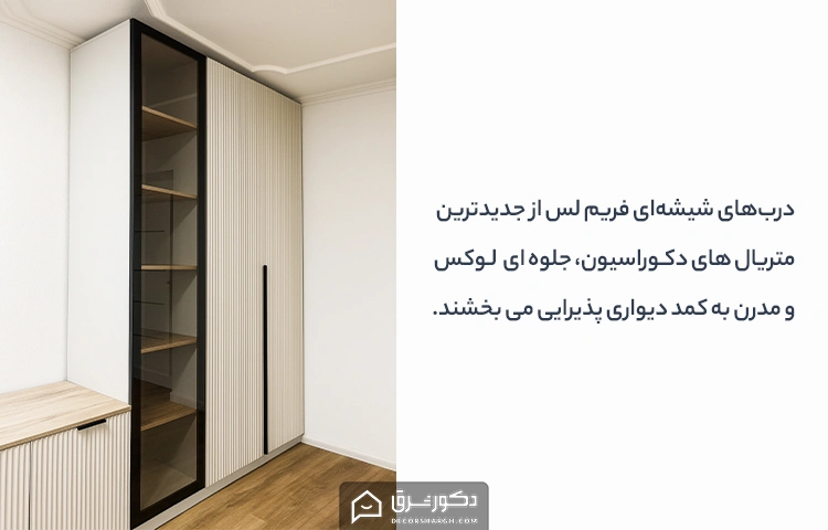 درب های شیشه ای فریم لس، به عنوان یکی از مدرن ترین متریال های دکوراسیون، جلوه ای لوکس به کمد دیواری پذیرایی شما می بخشد.